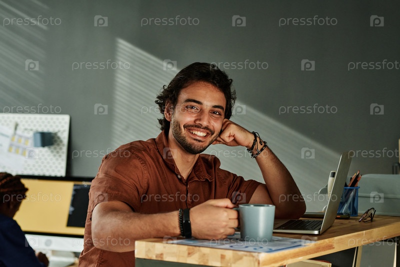 Счастливый молодой бизнесмен сидит у рабочего места в офисе