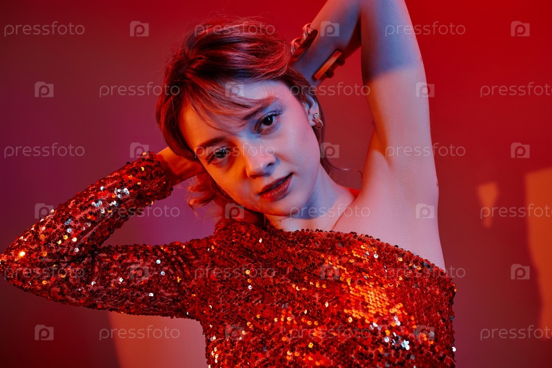Молодая женщина позирует в красном платье