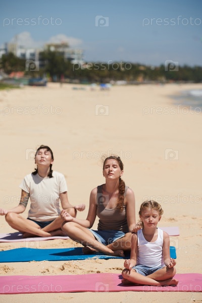 Люди, медитирующие на солнечном пляже