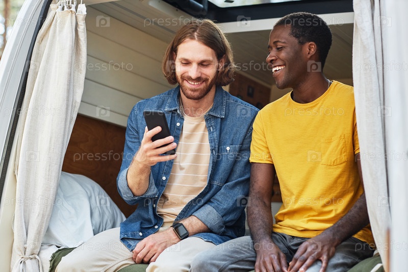 Друзья смотрят смешное видео по телефону