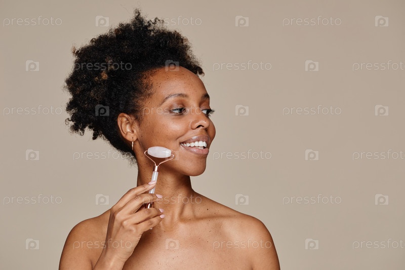 Молодая чернокожая женщина наслаждается массажем лица минимум