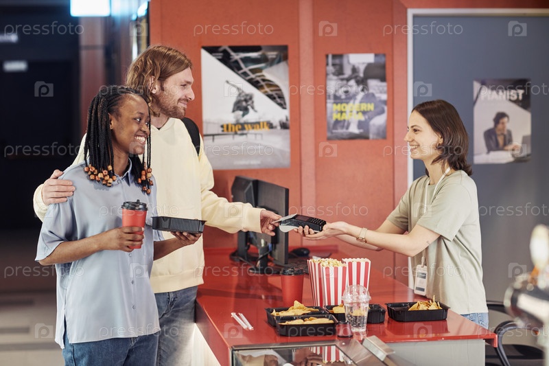Молодая пара покупает попкорн в кино