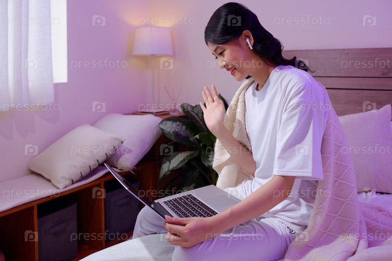 Веселая молодая женщина сидит на кровати