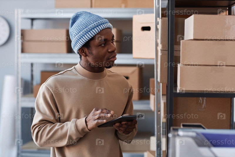 Молодой человек в повседневной одежде вводит данные на планшет, стоя у полки