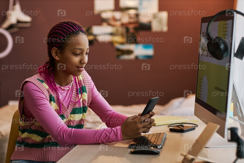 Чернокожая девочка-подросток использует смартфон дома, чтобы писать друзьям