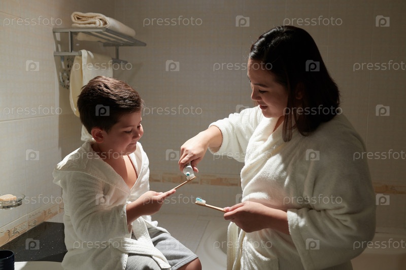 Мать и сын чистят зубы