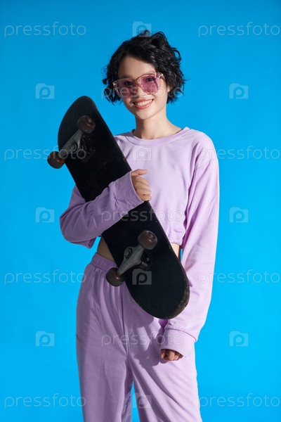 Веселая девочка-подросток держит скейтборд