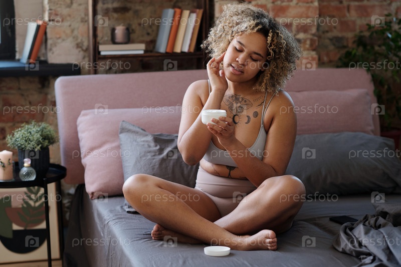 Молодая афроамериканская женщина с банкой крема, которая наносит его ей в лицо