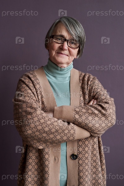 Пожилая женщина в кардигане и очках смотрит на камеру