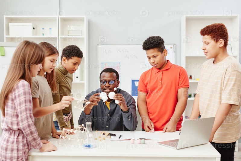 Разнообразная группа детей с учителем в классе химии