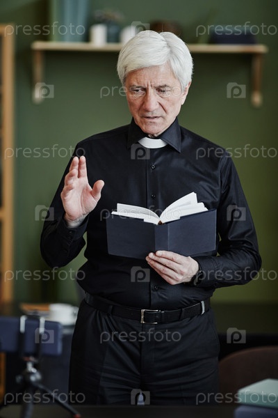 Старший священник держит Библию и записывает видео для онлайн-блога в офисе