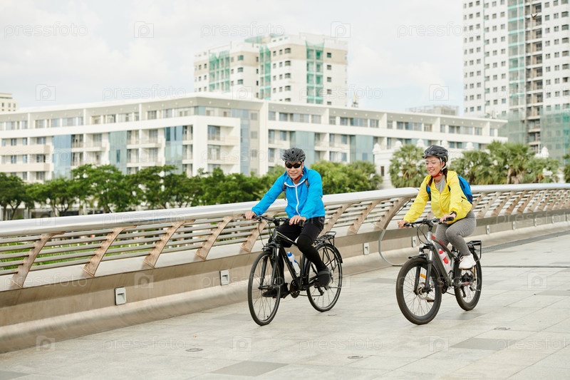 Веселая пара едет на велосипеде по мосту