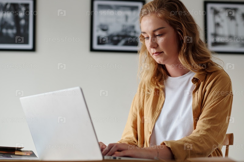 Молодая серьезная женщина-работница художественной галереи, работающая в сети перед ноутбуком