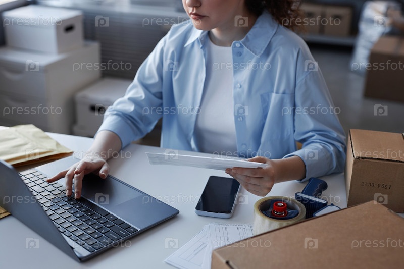 Близкий план молодой женщины в повседневной одежде, нажимающей кнопку на клавиатуре ноутбука