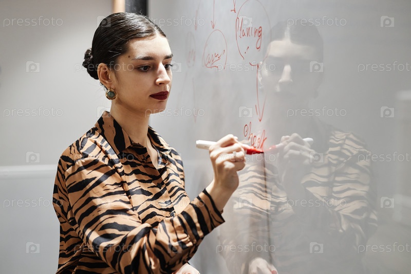 Элегантная ближневосточная деловая женщина пишет на доске в офисе