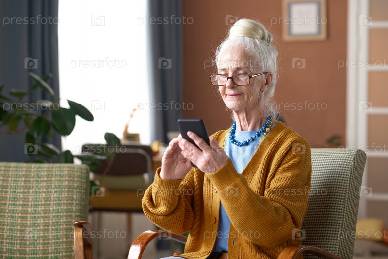 Пожилая женщина печатает сообщение на смартфоне