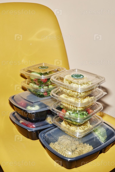 Заказ доставки продуктов питания в пластиковых контейнерах на желтом