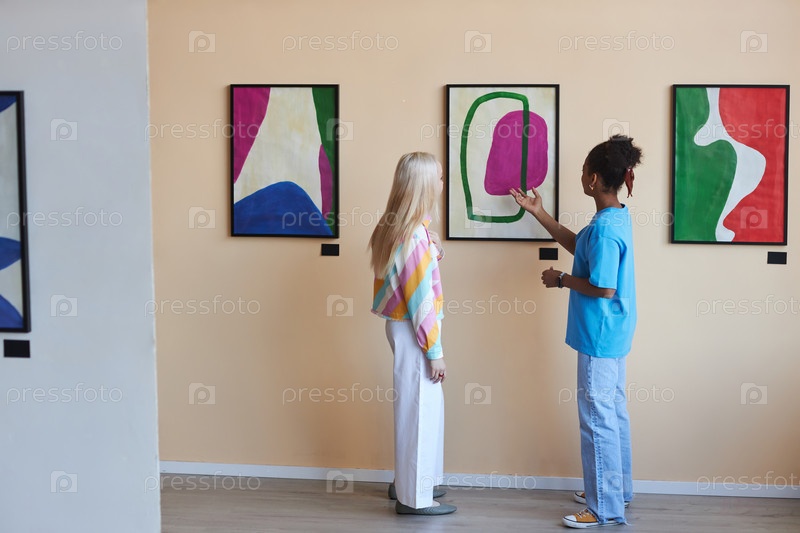 Две девочки-подростки обсуждают искусство в галерее или музее