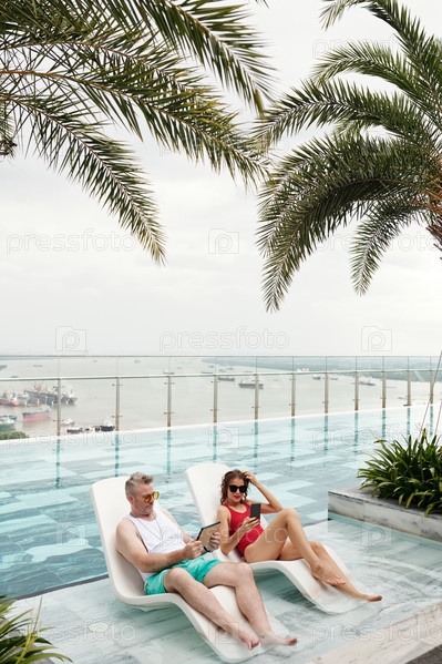 Пара загорает у бассейна