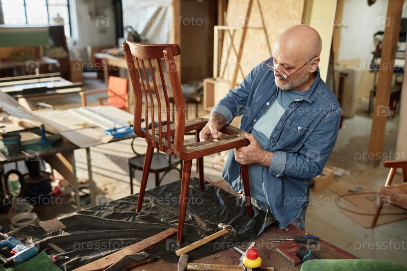 Старший ремесленник ремонтирует мебель в столярной мастерской
