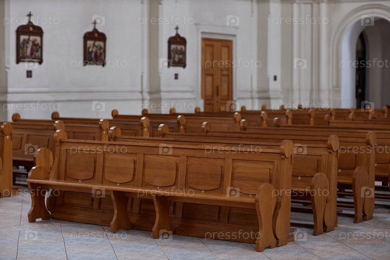Деревянные скамейки в старой церкви