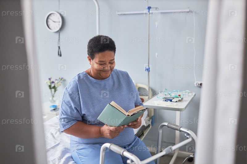 Улыбающаяся пожилая женщина читает книгу в больничной комнате