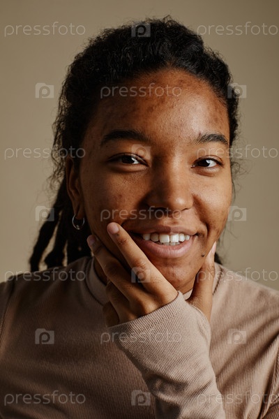 Ближайший снимок молодой чернокожей женщины, искренне улыбающейся и смотрящей на камеру