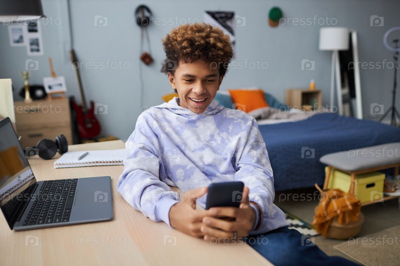 Улыбающийся подросток в повседневной одежде сидит за столом и пользуется мобильным телефоном