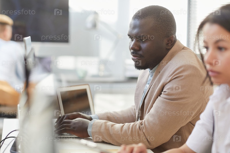 Чернокожий мужчина использует ноутбук, сидя в очереди в центре поддержки клиентов