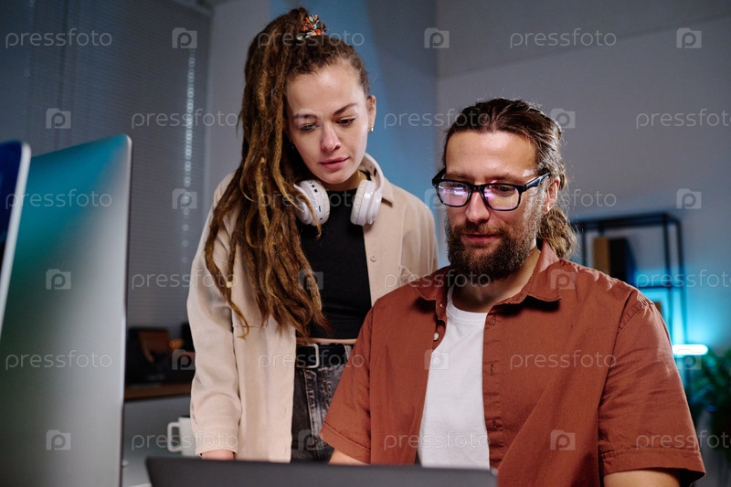 Два молодых серьезных ИТ-инженера смотрят на экран ноутбука