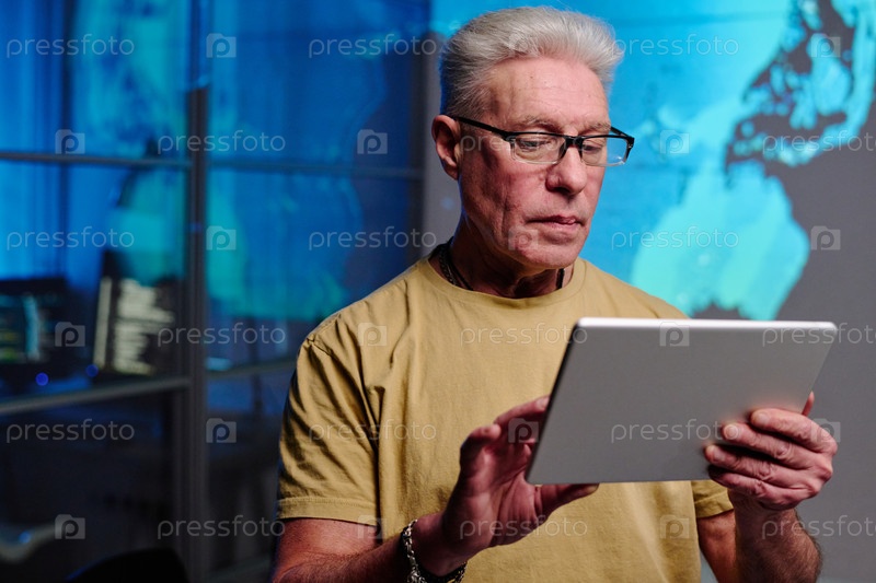 Серьезный зрелый бизнесмен с седыми волосами, использующий цифровой планшет