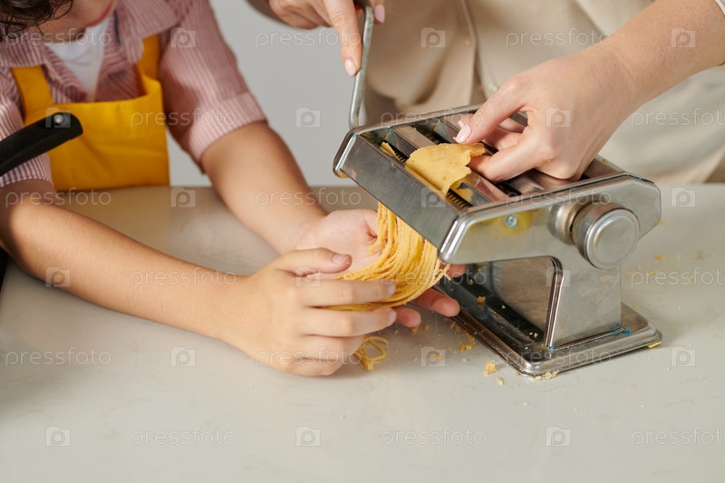 Мальчик помогает матери готовить спагетти