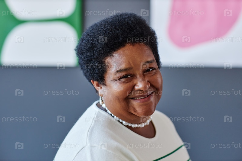 Счастливая зрелая афроамериканская женщина смотрит на камеру с улыбкой