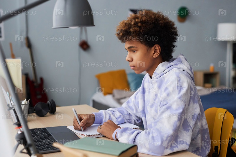 Серьезный школьник в повседневной одежде делает заметки во время онлайн-урока