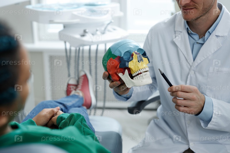 Ближайшее изображение мужского стоматолога, держащего модель черепа