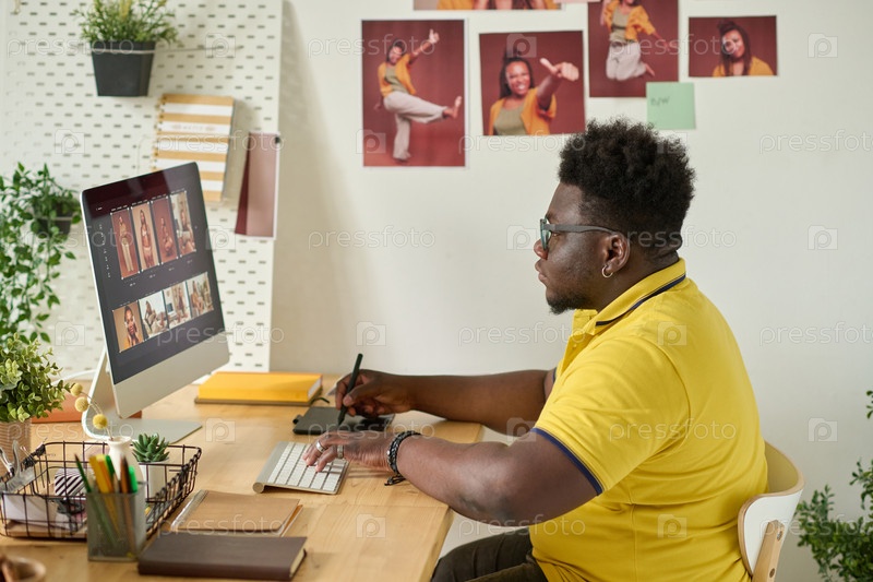 Африканский ретушер редактирует фото на компьютере