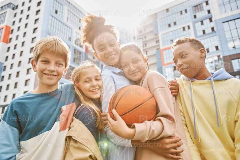 Группа молодых межкультурных друзей в повседневной одежде, смотрящих на камеру