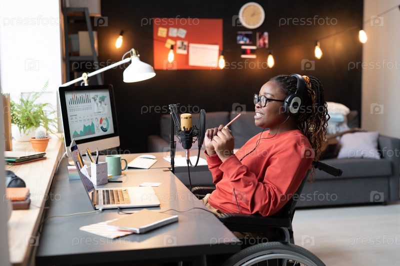 Блогер разговаривает в микрофоне дома