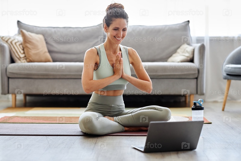 Улыбающаяся молодая женщина использует ноутбук в домашней тренировке йоги