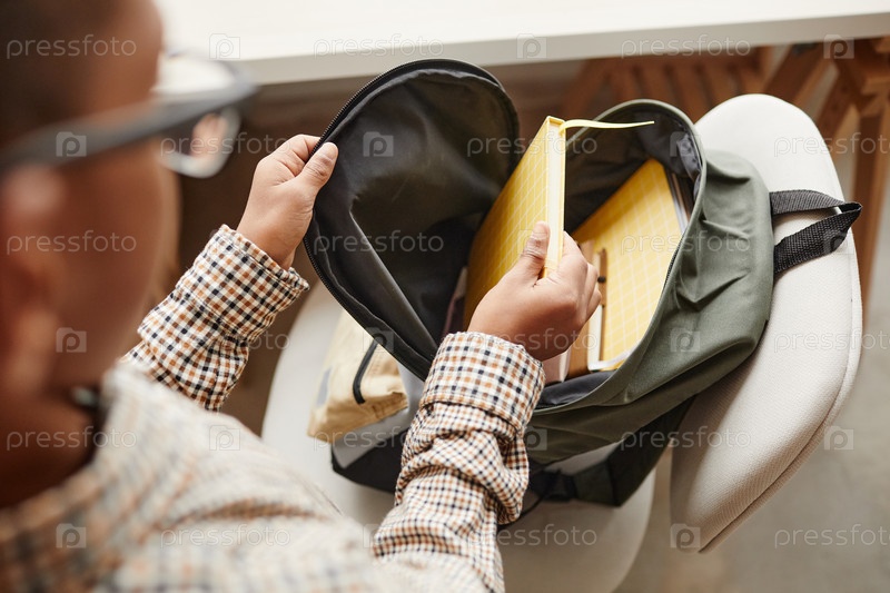 Афроамериканский мальчик упаковывает рюкзак для школы