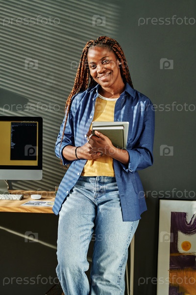 Молодая афроамериканская бизнесвумен в синей повседневной одежде