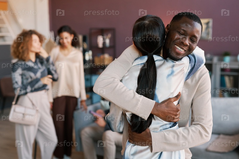 Афроамериканский парень обнимает молодую брюнетку на домашней вечеринке