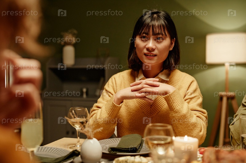 Молодая женщина сидит за обеденным столом
