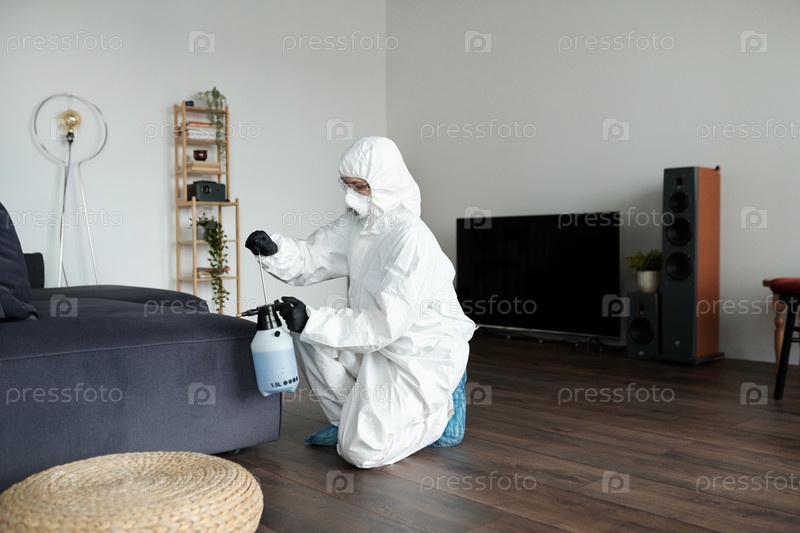 Уборщица в защитном костюме дезинфицирует мебель