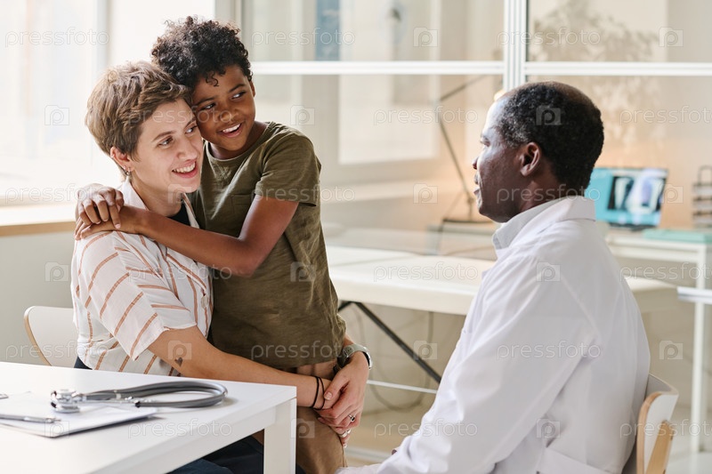 Мама с сыном посещают педиатра в клинике