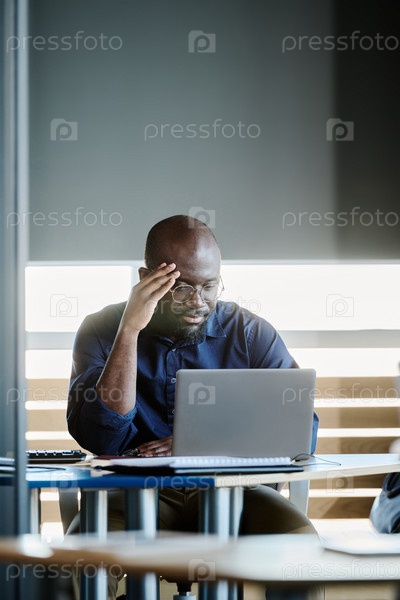 Серьезный молодой афроамериканский генеральный директор, сидящий перед ноутбуком