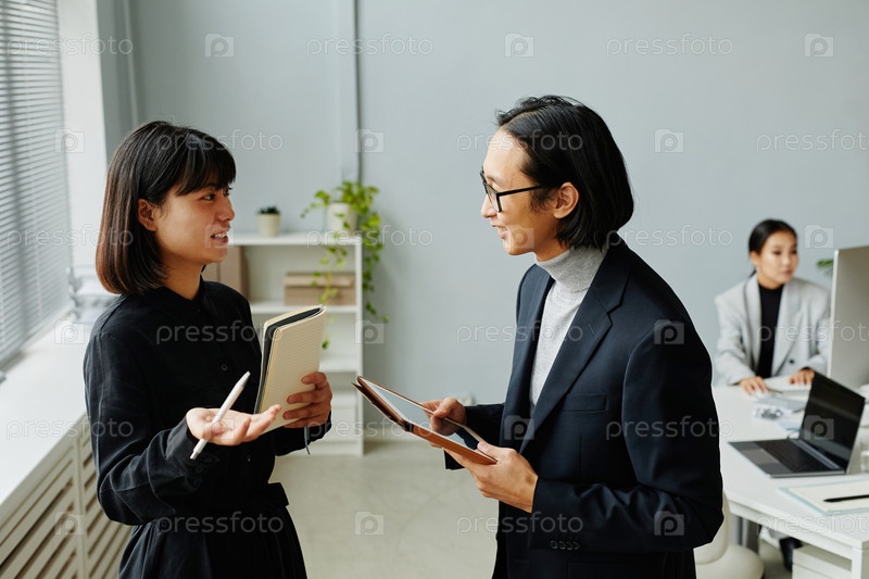 Молодая азиатская женщина разговаривает с коллегой в офисе
