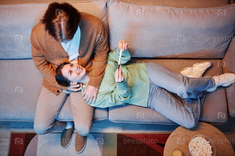 Вид сверху молодой пары, обнимающейся на диване дома вечером