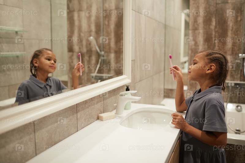 Девушка, которая чистит зубы в зеркале