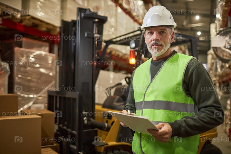 Бородатый работник смотрит на камеру в складе